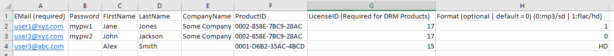 - Format: The format field is optional and is only used for SD and HD video or non-DRM protected MP3 and FLAC audio files. If the product is video, enter 0 to deliver SD quality video or 1 for HD quality video. If the product is non-DRM protected MP3 or FLAC audio files, enter 0 to deliver an MP3 file or 1 for a FLAC file.