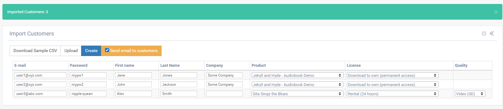 There are scenarios where you might want to provide content to new or existing customers without asking them to purchase or redeem an unlock code. For example, you want to provide all attendees of a conference with a video of the event, or all reviewers with a new eBook, or perhaps you need to provide digital textbooks to all students enrolled in a course. This feature allows you to do just that… import a list of emails and products with the desired license and FlickRocket will automatically create the account, add the content, and send an email with access information to each customer… and all this can be completed in minutes.