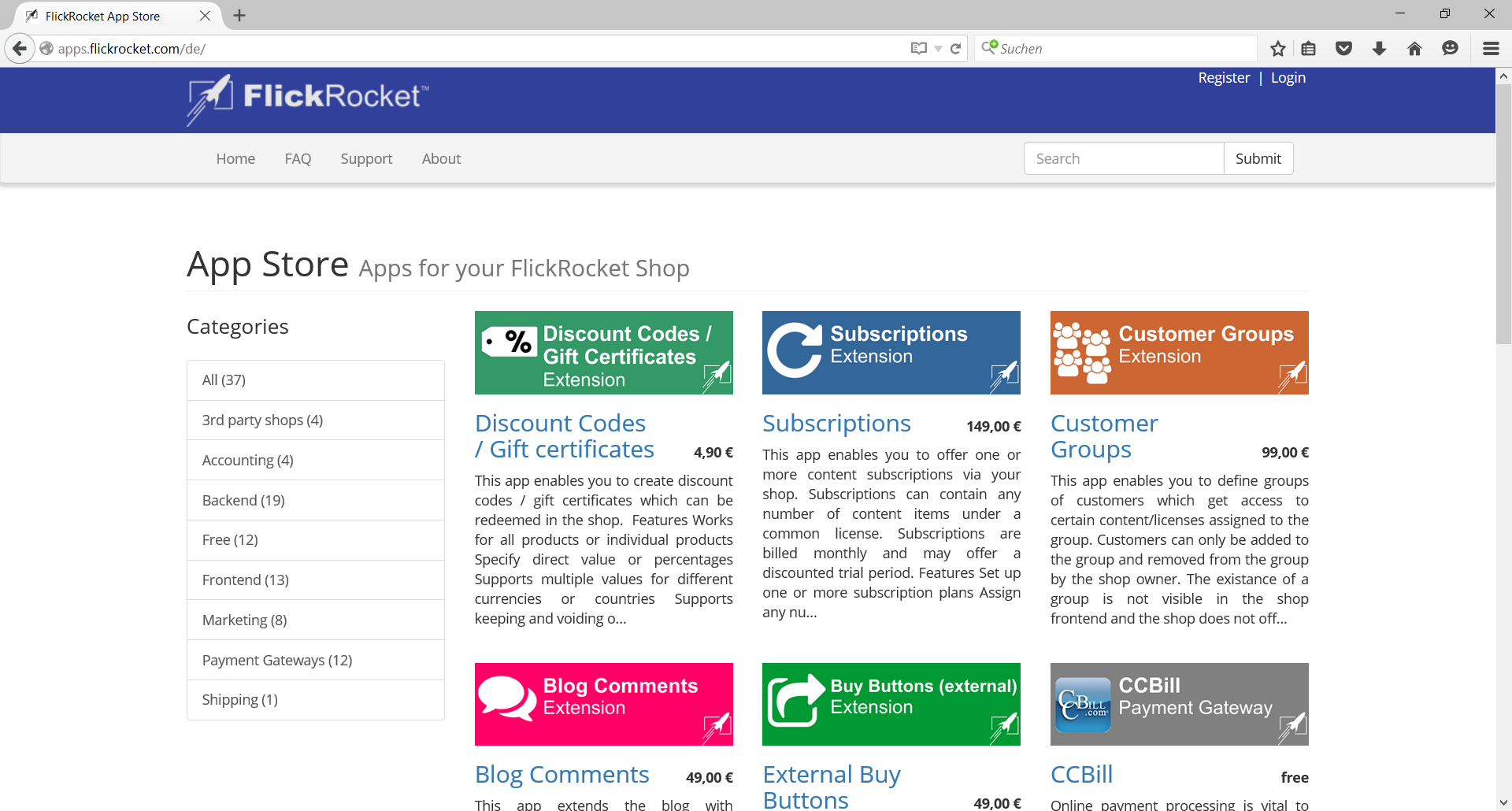 The new FlickRocket App Store enables shop owners to add new features or extend existing features to shops without having to upgrade to higher plans.
