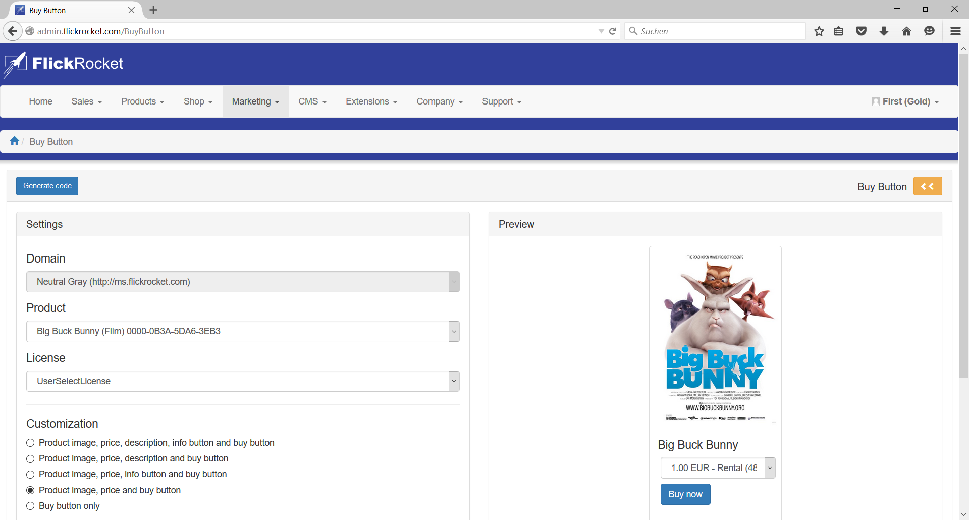 Open up more sales channels by adding flexible buy buttons for your products/licenses and adding them to external web sites. Included in SILVER and GOLD and available in the FlickRocket App Store for BASIC.