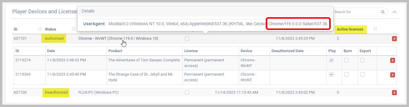 If you click on a device with Active licenses, you will see a list of the active licenses and which license (Play, Burn, Export) is active. Like the device authorization, it is possible to reset only the license by clicking the red X as well. Hovering over the device will show the browser version or Flux Player version.