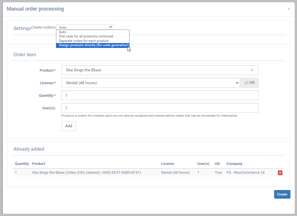 *NOTE: The content is typically automatically assigned directly to the customer's player account. The Create codes option provides the ability to provide unlock codes instead. You can provide a single code for each product in the order or a separate code for each product. These codes will appear under the Orders page when the customer is logged to their account or in the product info in the player apps.*