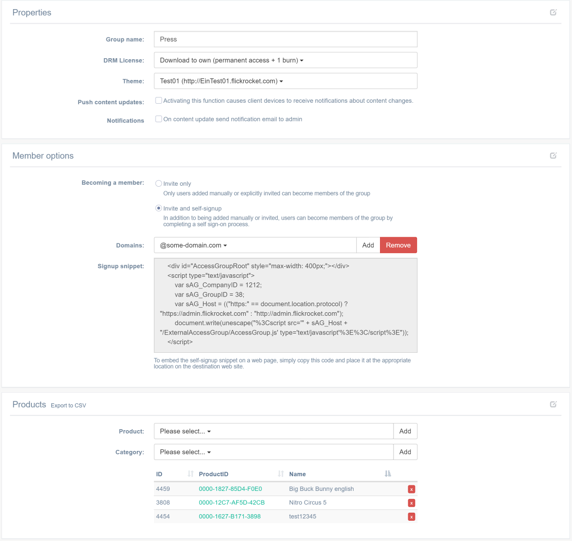 You can also create groups yourself and define licenses to be issued for all members of such groups. This makes for example sense if you have a closed customer group which should have access to certain movies without going through the purchase process. This can for example be used for screener distribution or groups of people that have already paid for the content by arrangements outside of the scope of FlickRocket such as pay TV customers.