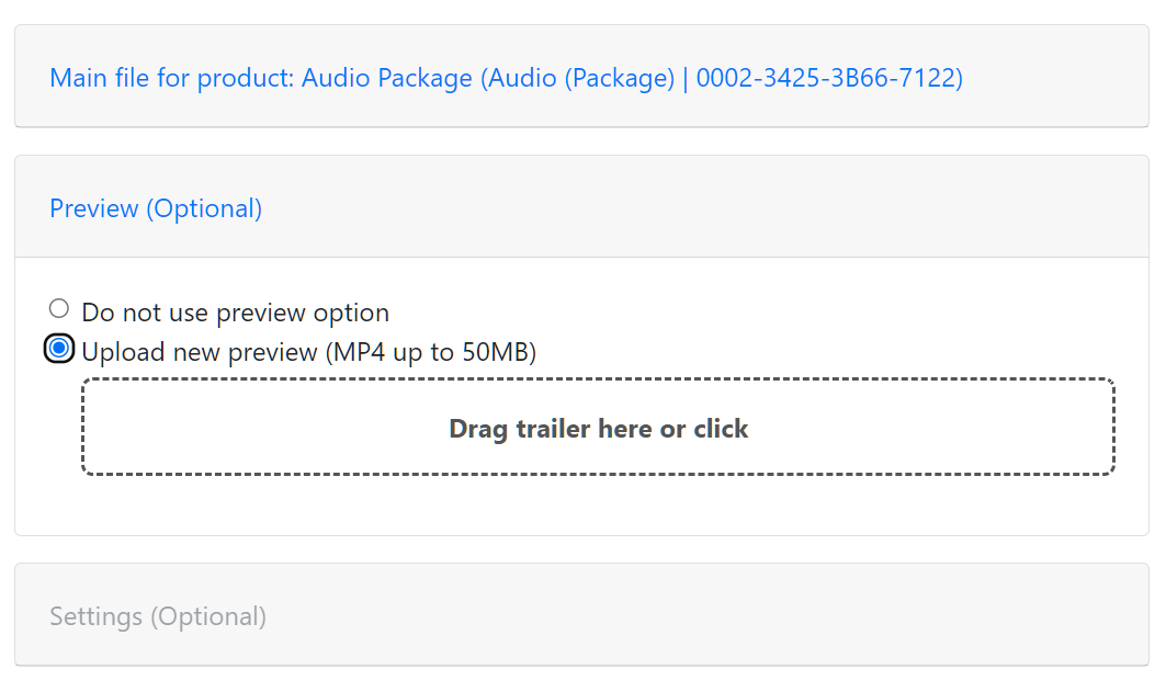 Product previews can be uploaded with the initial content upload or later in a second upload. Just ignore the main upload and select "Preview (Optional)".