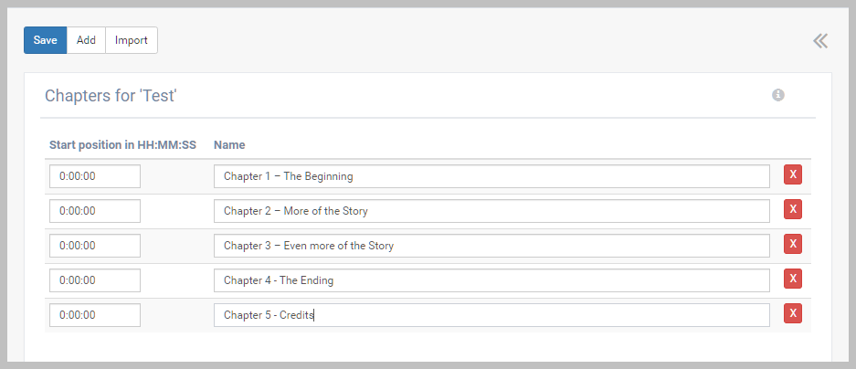 Adding chapter points makes it easier for your customers to navigate the video. Chapter points allow the user to skip forward or backward by chapter using the seek bar or direct navigation to a chapter from the menu. Adding a descriptive name for each chapter makes the navigation even easier.