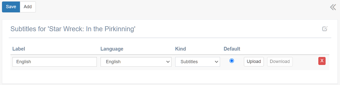 Click ADD to create a new entry, enter a label, choose the text language, select the kind of text (subtitle or caption) and upload the vtt file with the upload button. Click Save to finaly store the settings.