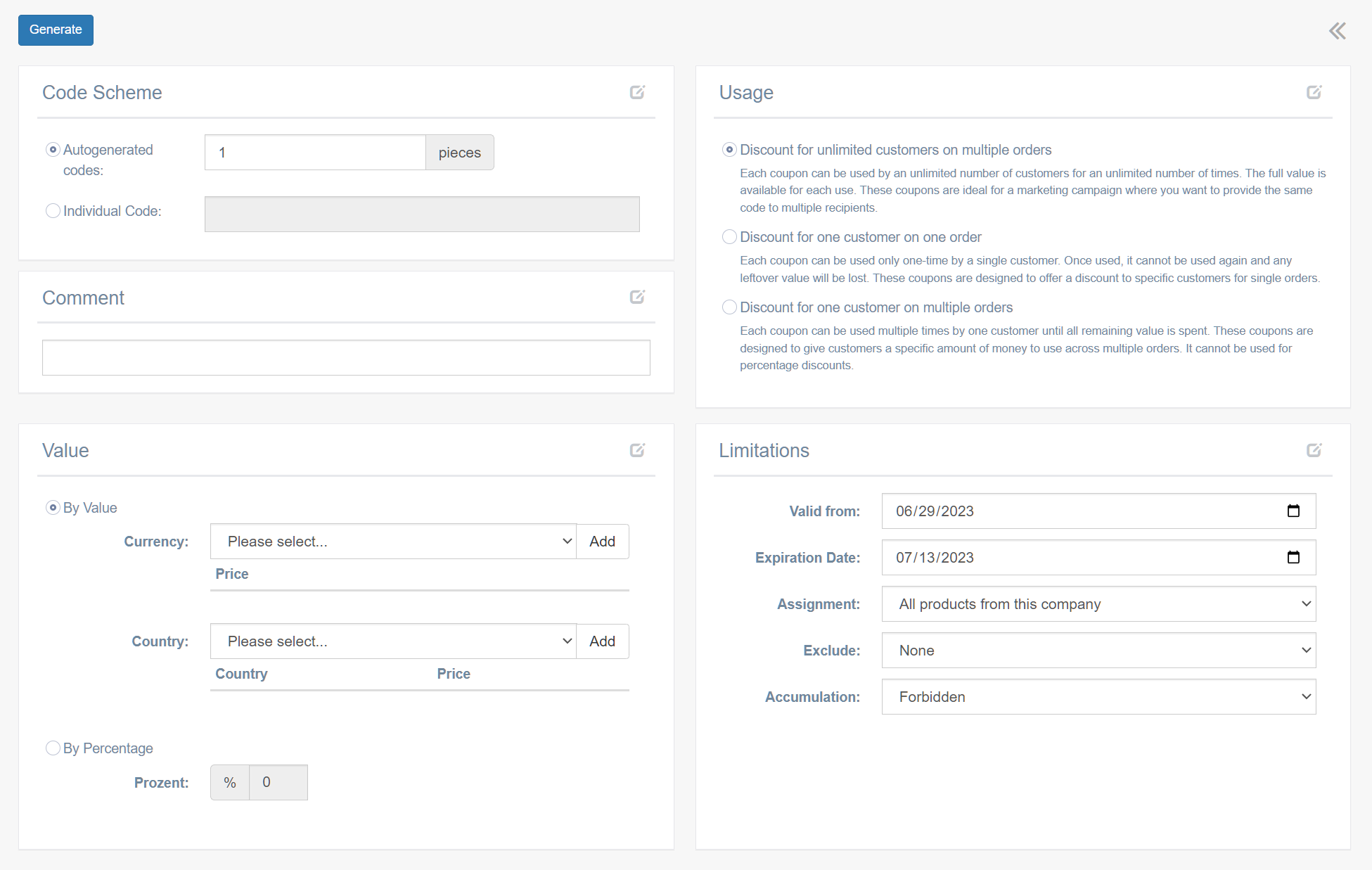 This setting allows you to limit the code to only one usage (default). Alternatively, you can make the code valid for multiple purchases, which is equal to a rebate on any purchase. |