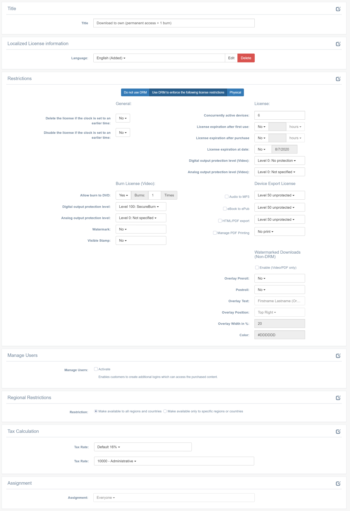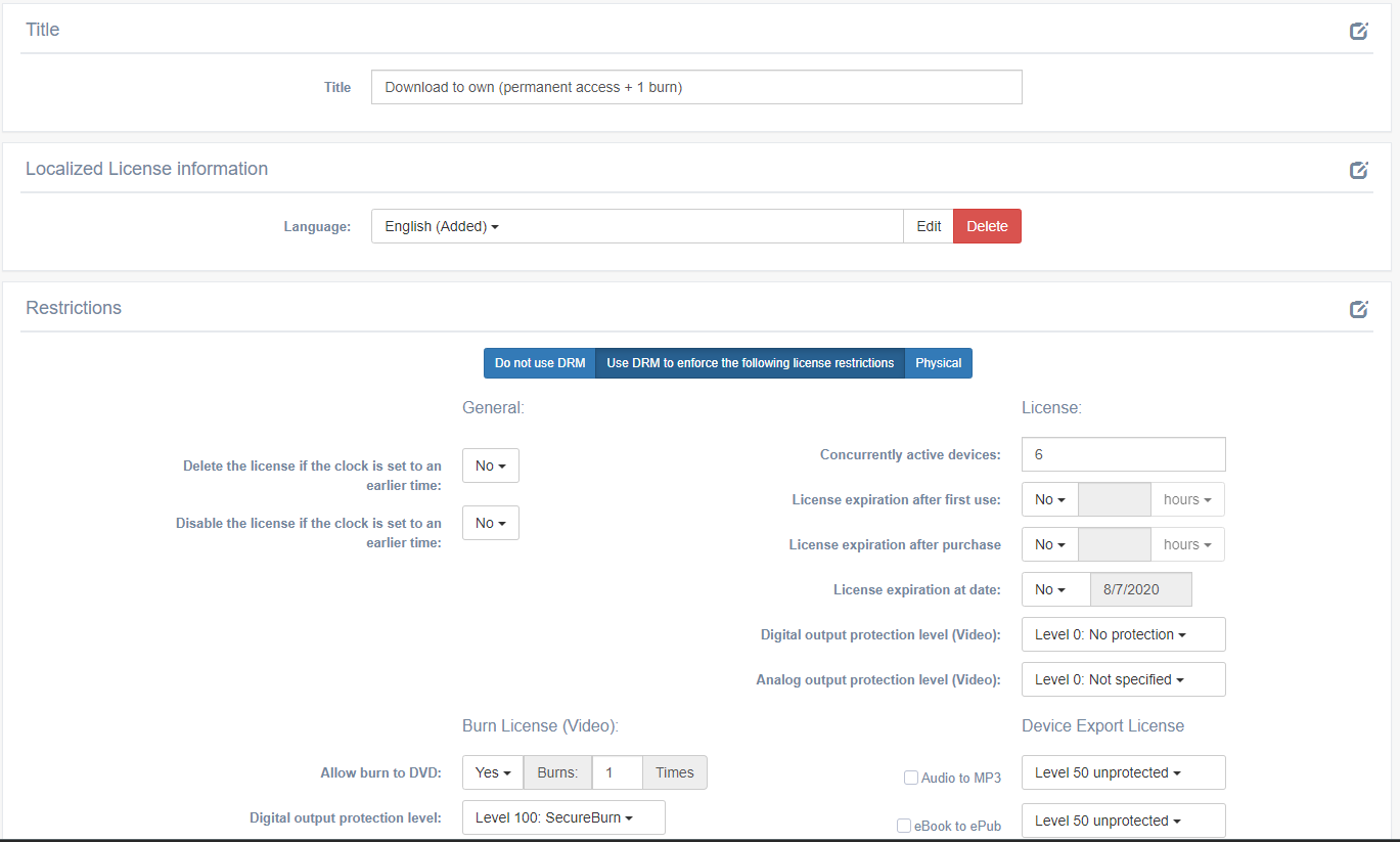 By setting the restrictions, you can specify what is or is not possible with the content purchased under a certain license. Please see the table below for details.