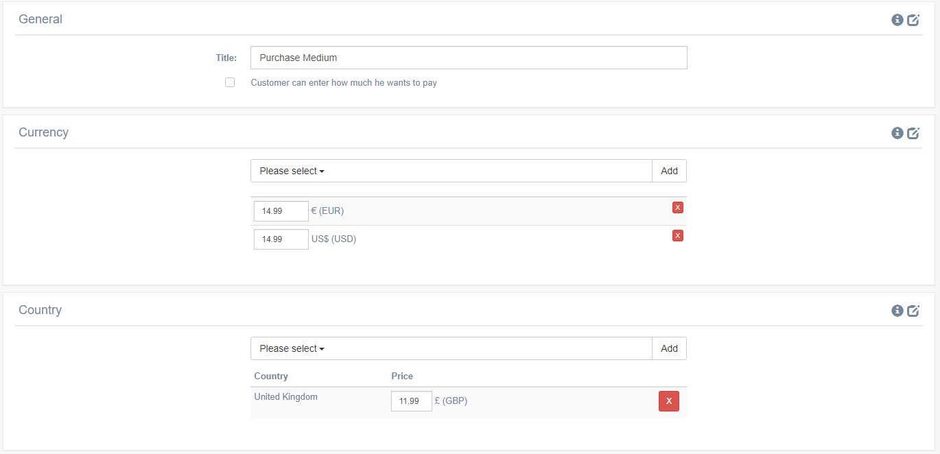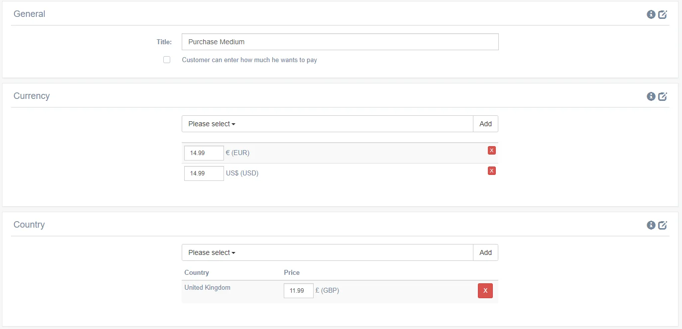These price models enable you to set USD ($) and EUR (€) prices, as well as prices per language.