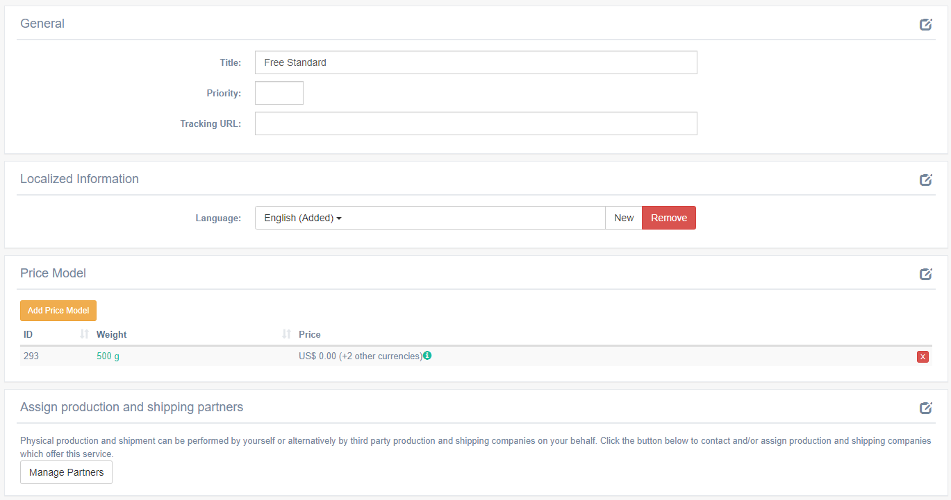 These price models define the shipping price. Each price model is responsible for at least one destination country and has a maximum weight. The web shop automatically selects the correct price model based on destination country and weight of the shipment. This price model also defines who is responsible for manufacturing and shipping of the discs.