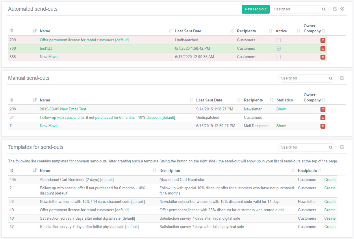 A send-out defines the actual sending of the prepared content to recipients. It can either be rule based or manually triggered.
