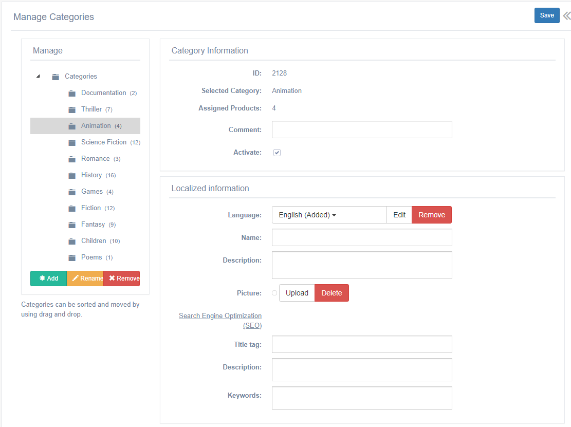 For each category you define you can also enter localized information. This information also includes SEO (search engine optimization) information which is important for the ranking of your shop in search engines.