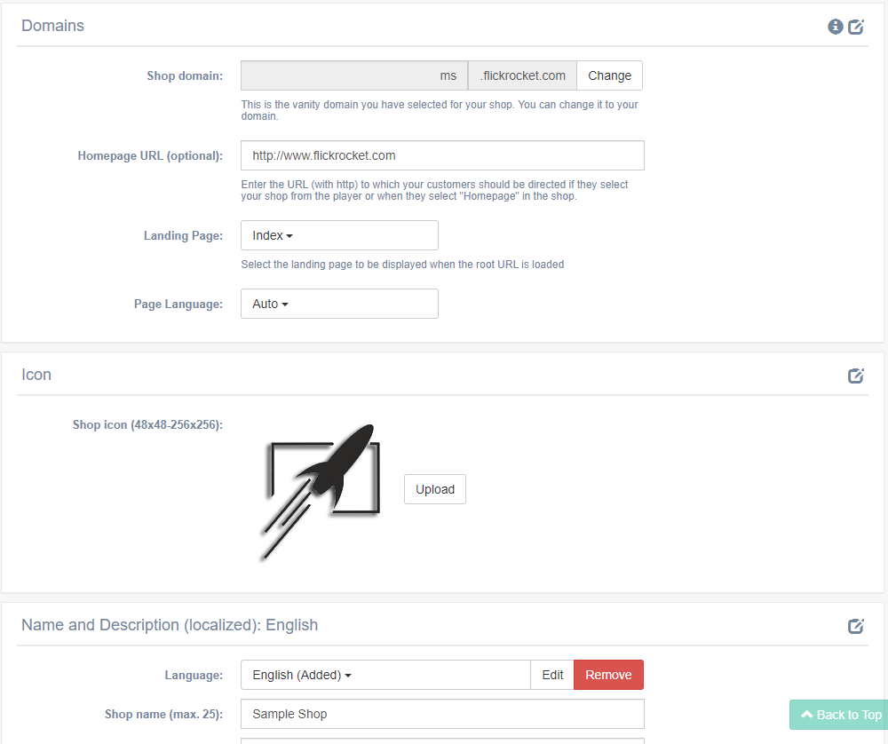 Domain(s): A domain defines how to access the store. After signup, Flickrocket automatically creates a numeric domain such as “1234567.flickrocket.com” under which you can reach your shop. you can change this domain to a vanity domain (e.g. myshop.flickrocket.com) or your own domain (e.g. shop.mydomain.com).